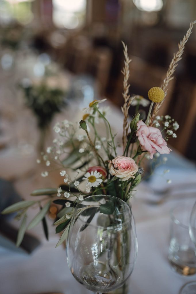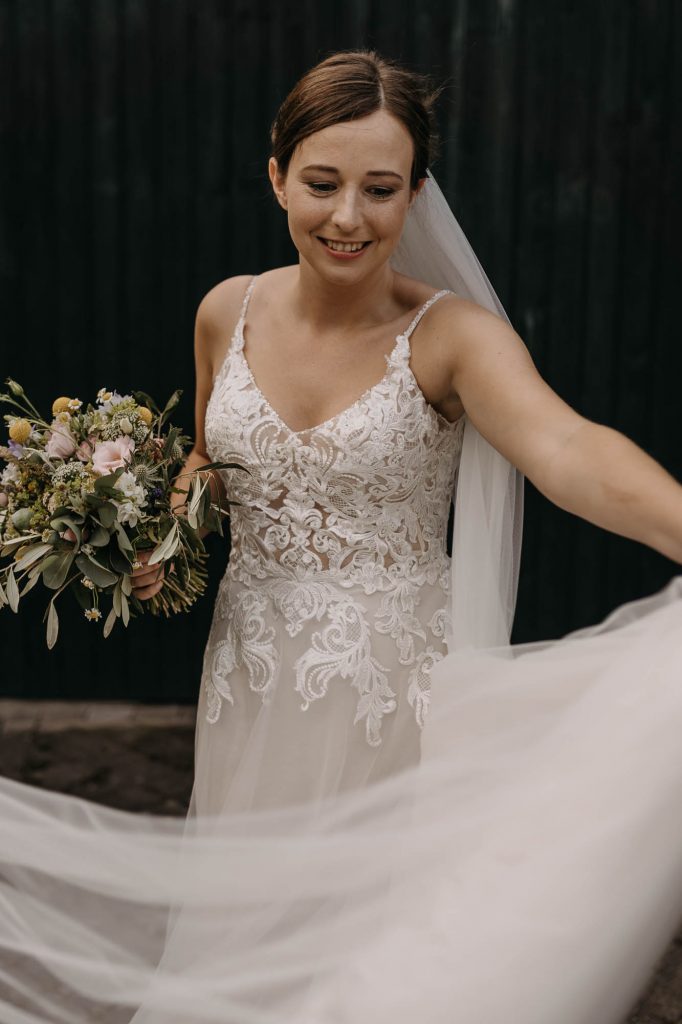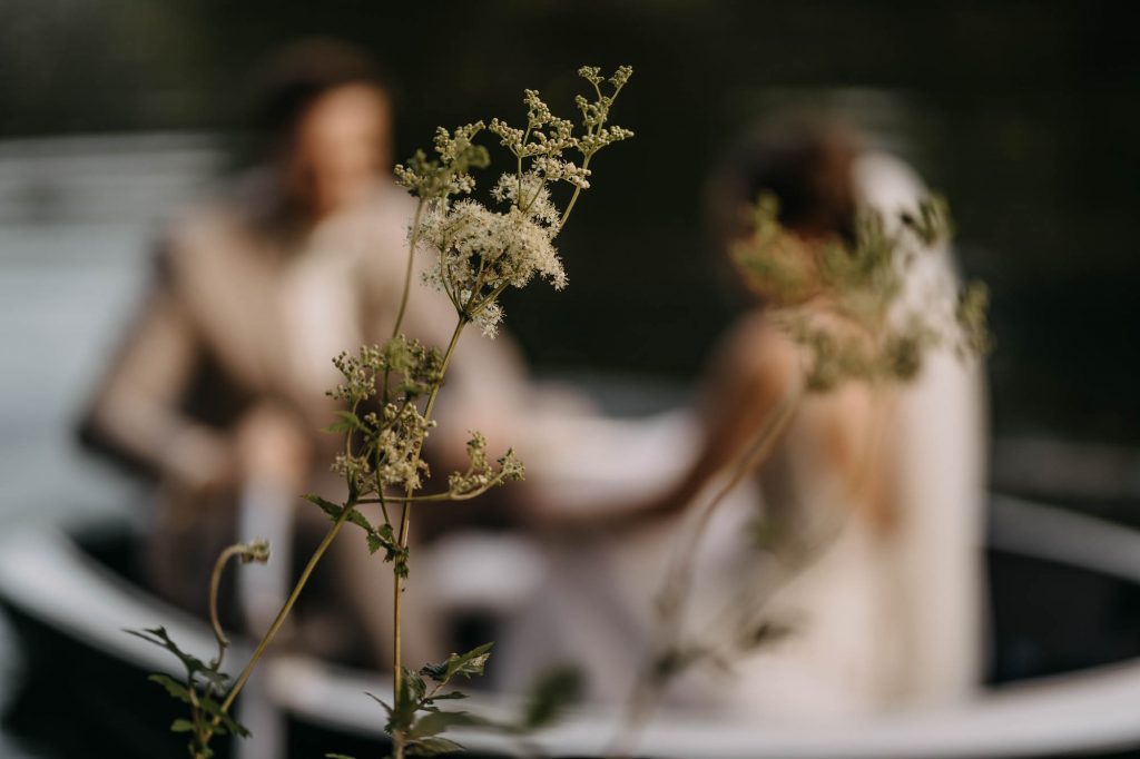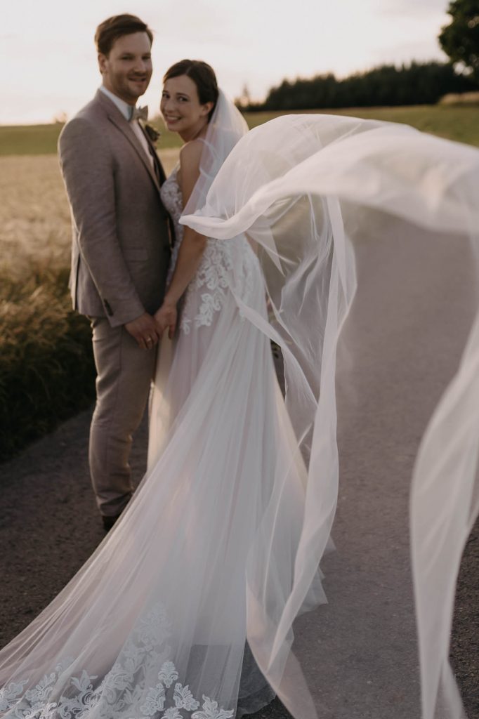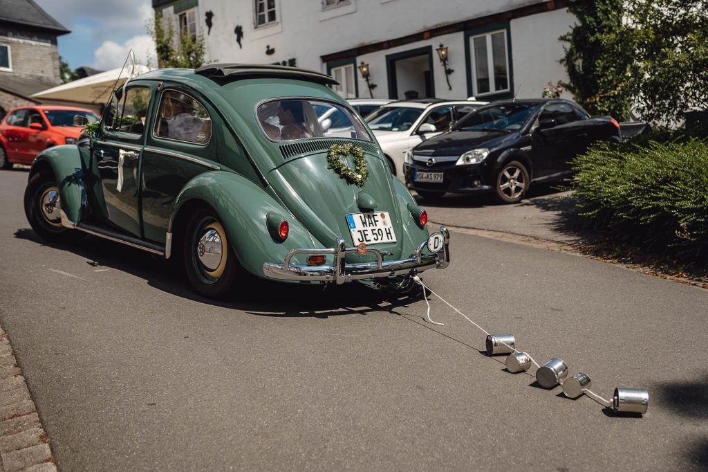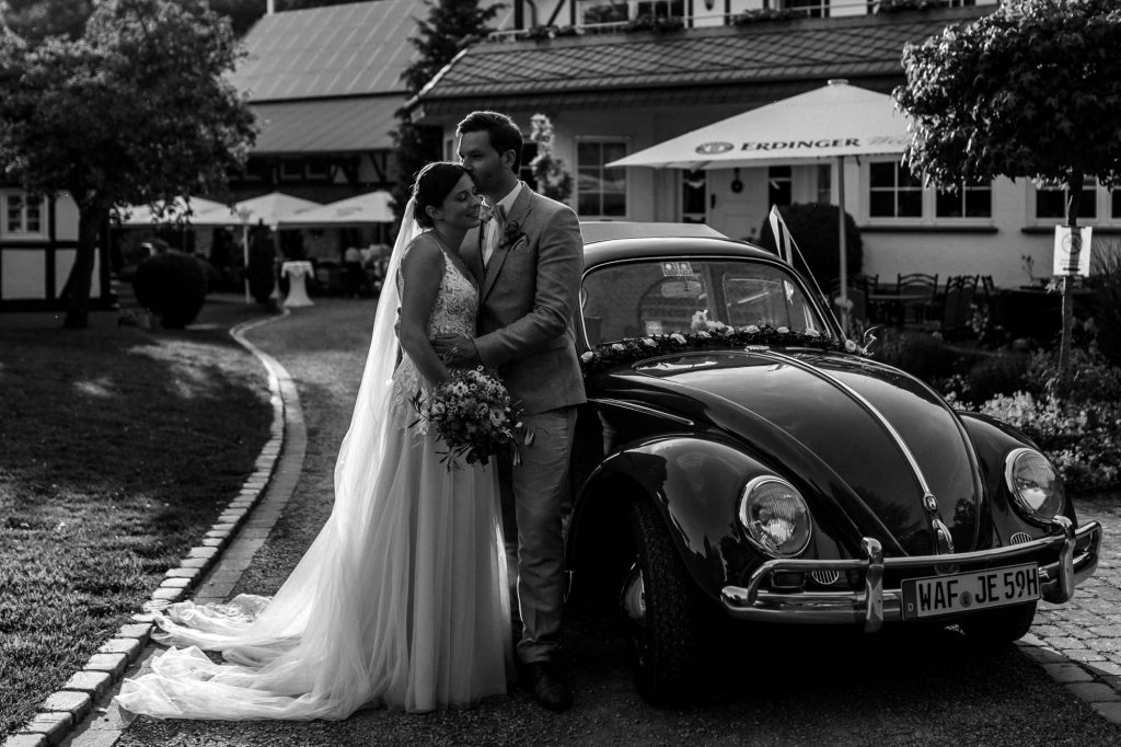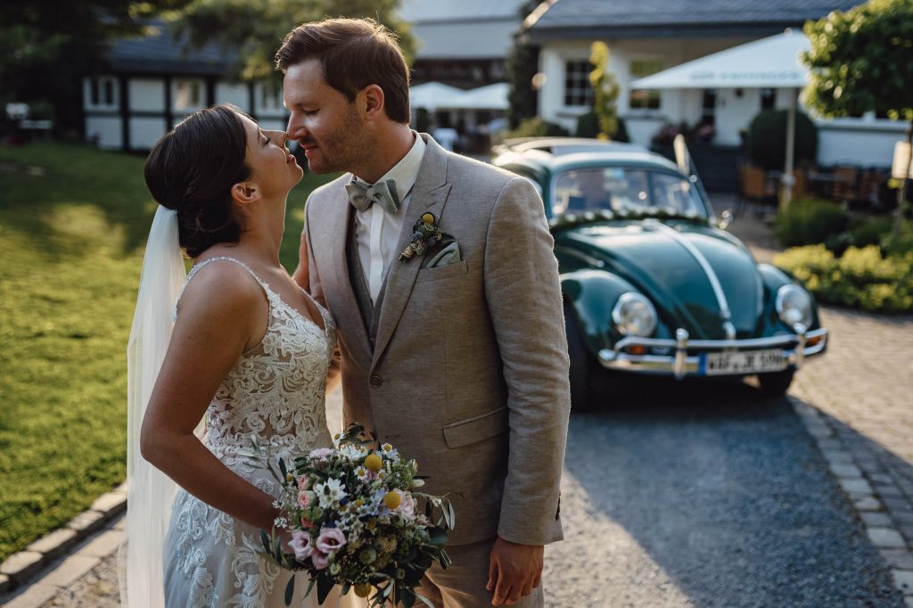 Danach ging es mit einem Oldtimer aus der Familie zur Grewen Mühle, mit einem stimmungsvollen Sektempfang mit vielen tollen Überraschungen für die beiden. Während die Gäste das leckere Essen und den super Service in der Grewen Mühle genossen (das hat das Brautpaar natürlich vorher auch getan), haben wir uns zu einem entspannten Spaziergang zum Sonnenuntergang für ein paar Paarfotos auf den Weg gemacht. Der wunderschöne Blumenschmuck war vom Hofgarten Wallen.