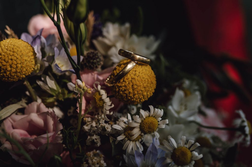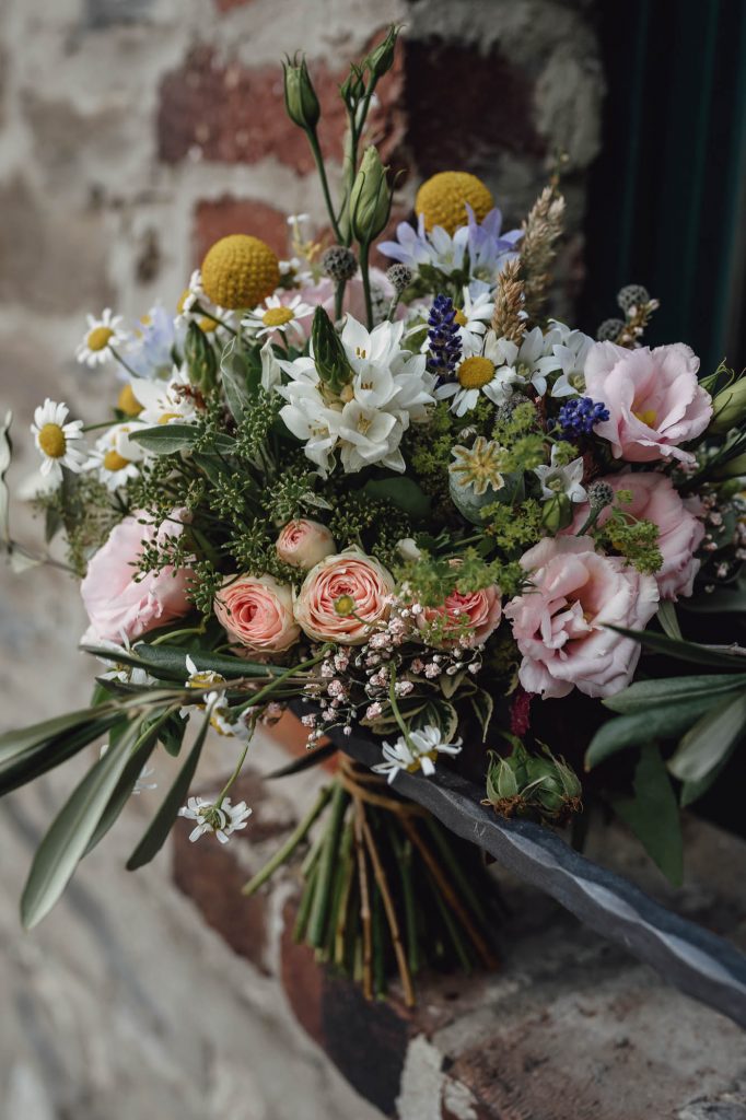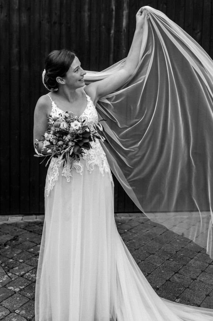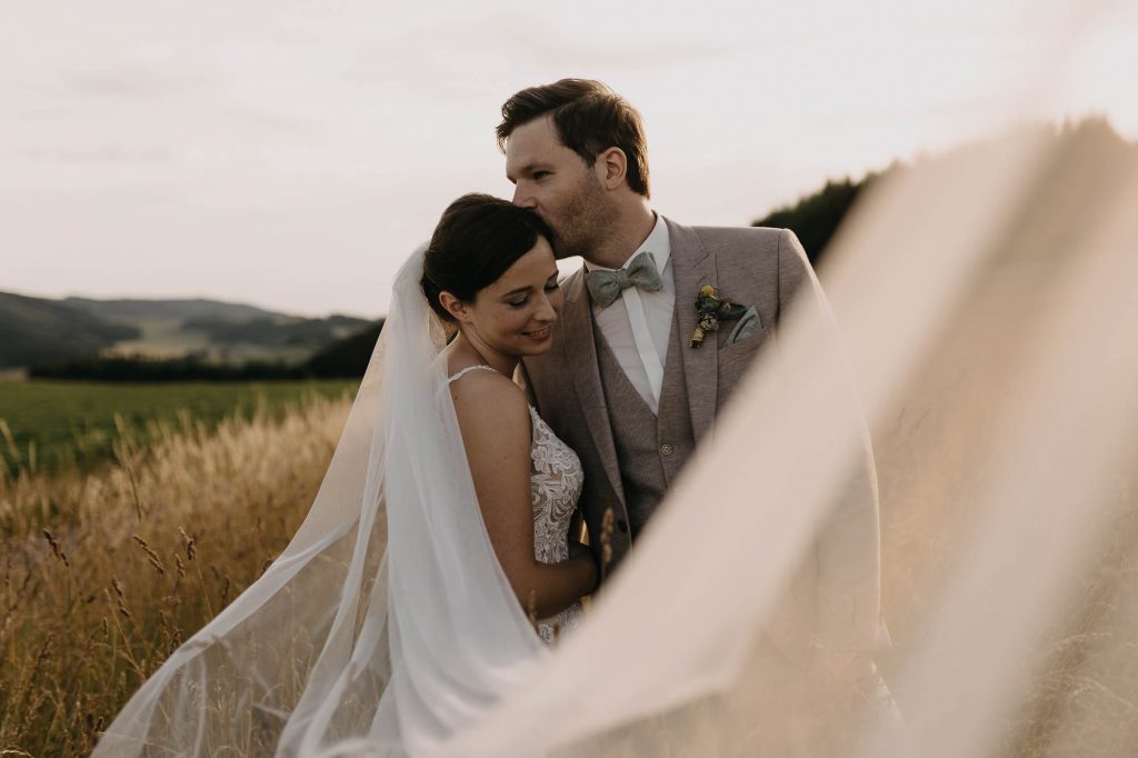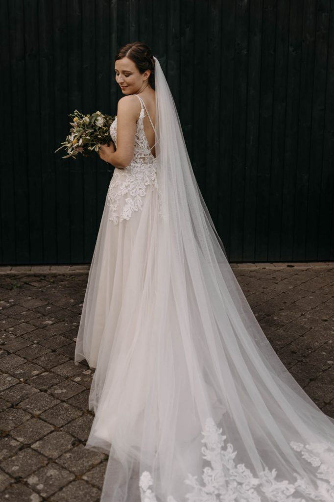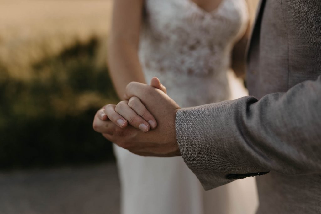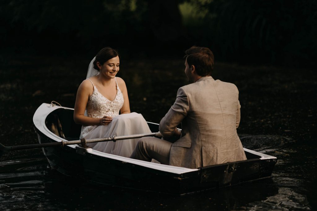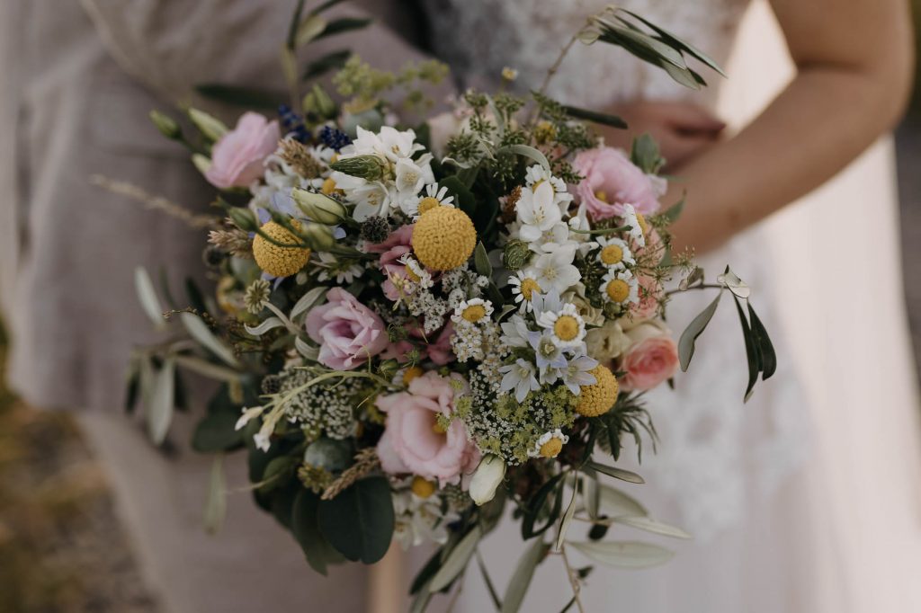 Danach ging es mit einem Oldtimer aus der Familie zur Grewen Mühle, mit einem stimmungsvollen Sektempfang mit vielen tollen Überraschungen für die beiden. Während die Gäste das leckere Essen und den super Service in der Grewen Mühle genossen (das hat das Brautpaar natürlich vorher auch getan), haben wir uns zu einem entspannten Spaziergang zum Sonnenuntergang für ein paar Paarfotos auf den Weg gemacht. Der wunderschöne Blumenschmuck war vom Hofgarten Wallen.