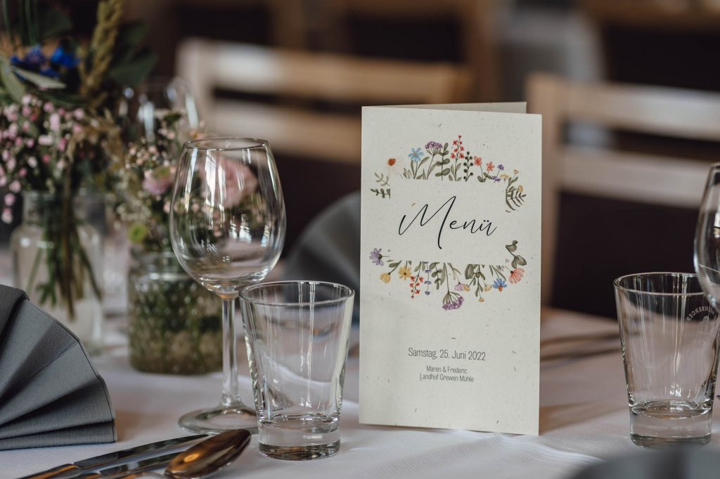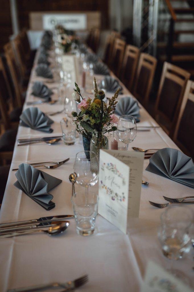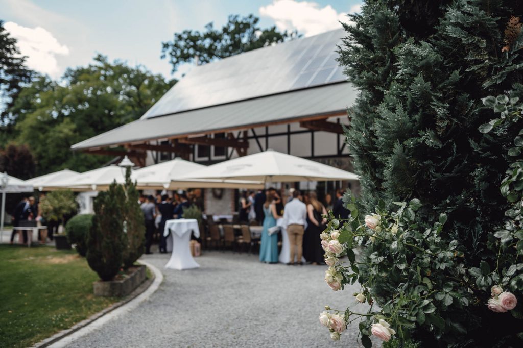 Afterward, they drove to the Grewen Mühle in a family vintage car, where they enjoyed an atmospheric champagne reception with many wonderful surprises for the couple. While the guests enjoyed the delicious food and excellent service at the Grewen Mühle (the bride and groom had, of course, done so beforehand), we went for a relaxing stroll at sunset for some couple photos. The beautiful floral arrangements were from the Hofgarten Wallen.