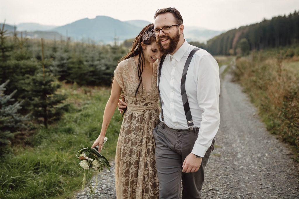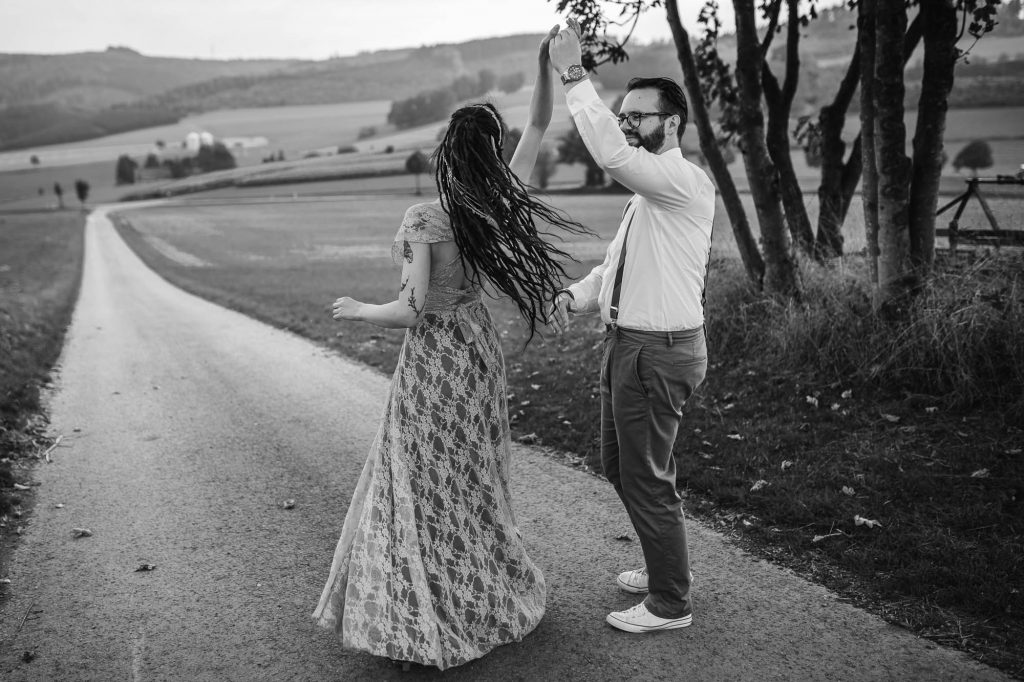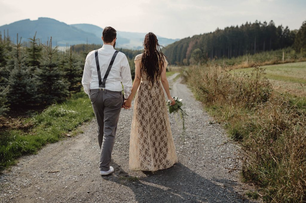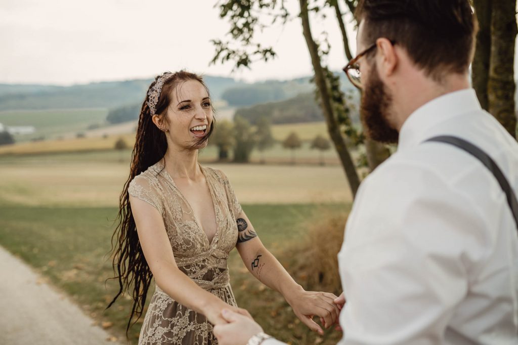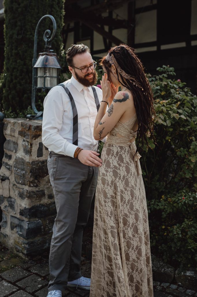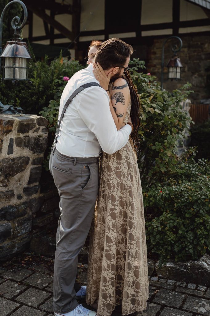 Annika und Christian haben ihre tolle Sommerhochzeit in der Wenks Stube in Meschede genau so gefeiert, wie sie es sich immer gewünscht haben. Der wundervolle Tag startete mit einem aufregenden First Look auf dem Hof und einem anschließenden Spaziergang mit den beiden, bei dem wir wundervolle Paarfotos gemacht haben. Als wir zurück zur Feierlocation kamen, trafen auch die Gäste langsam ein. Bei einem gemütlichen Sektempfang haben wir gewartet, bis alle da waren.