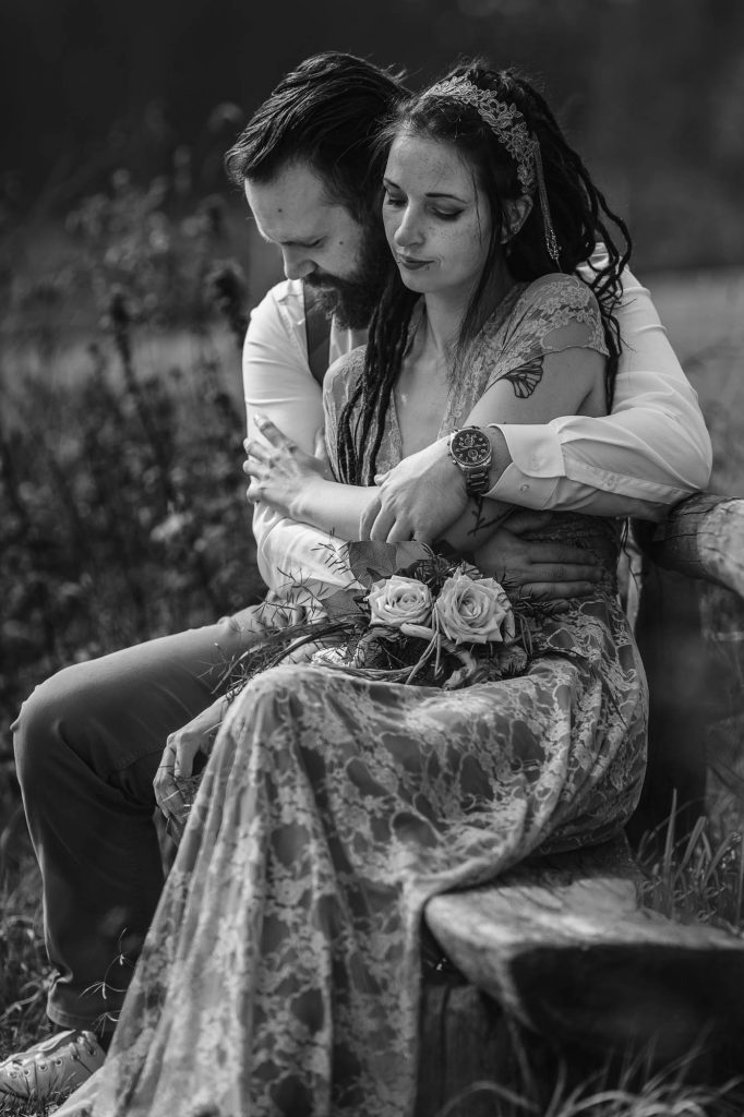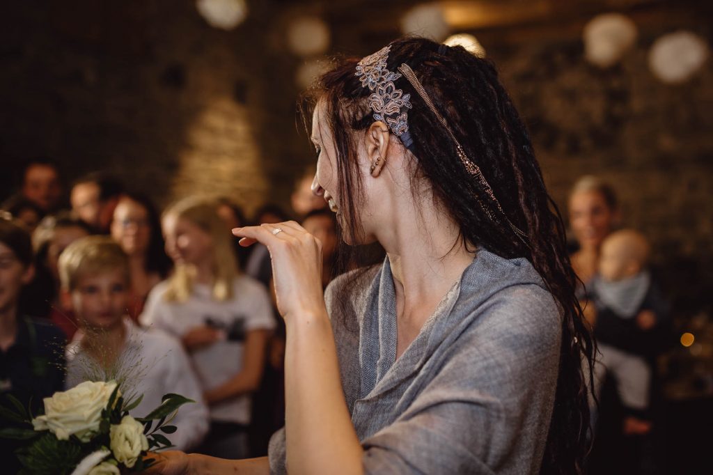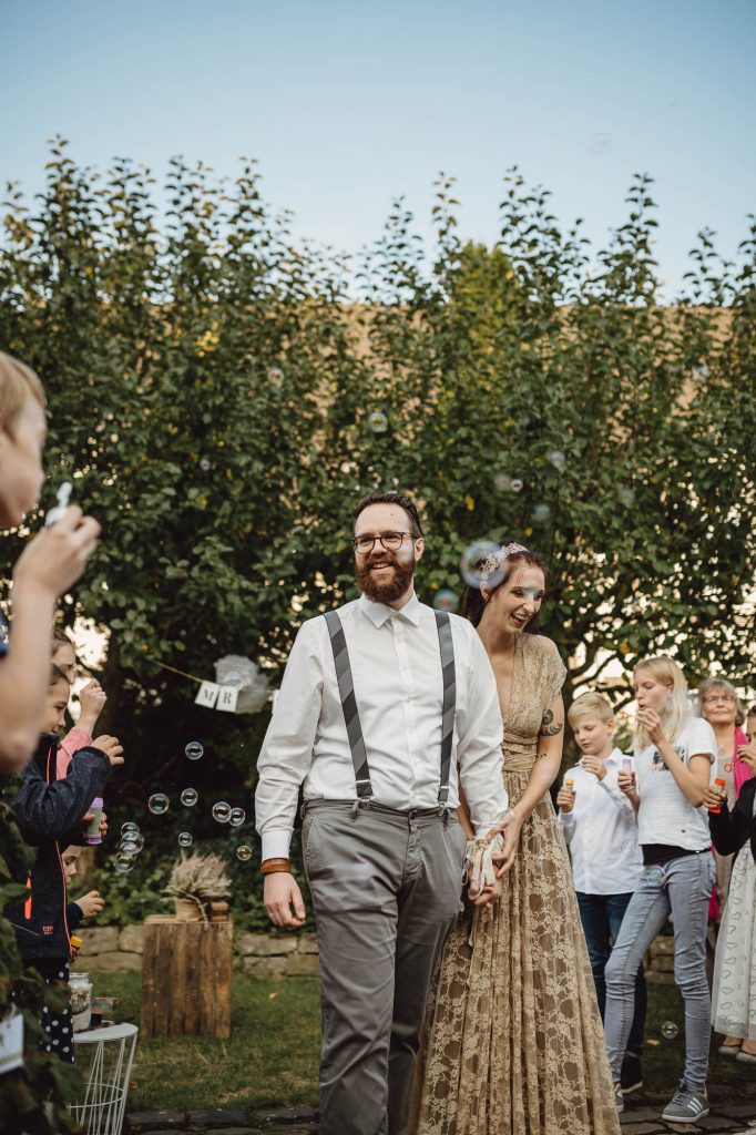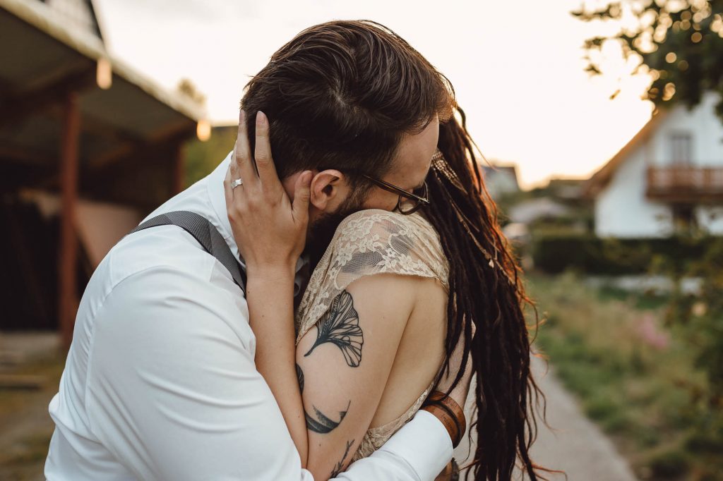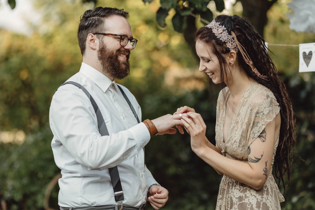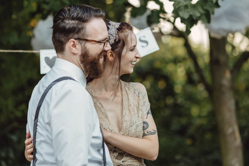 Anschließend fand im Garten eine sehr emotionale und persönliche freie Trauung statt, die komplett von der Familie und Freunen gestaltet wurde. Die gemütliche Feier auf dem Wenkshof wurde von vielen kleinen Überraschungen der Gäste, einem tollen Essen von Dreyers Catering und einer ausgelassenen Party gekrönt.