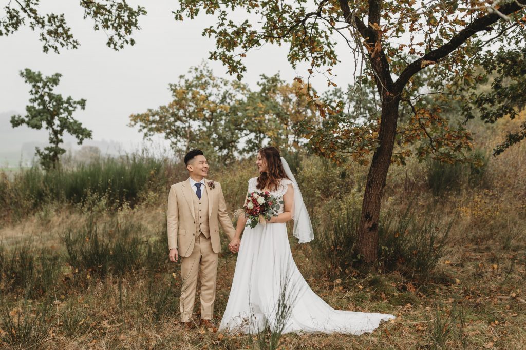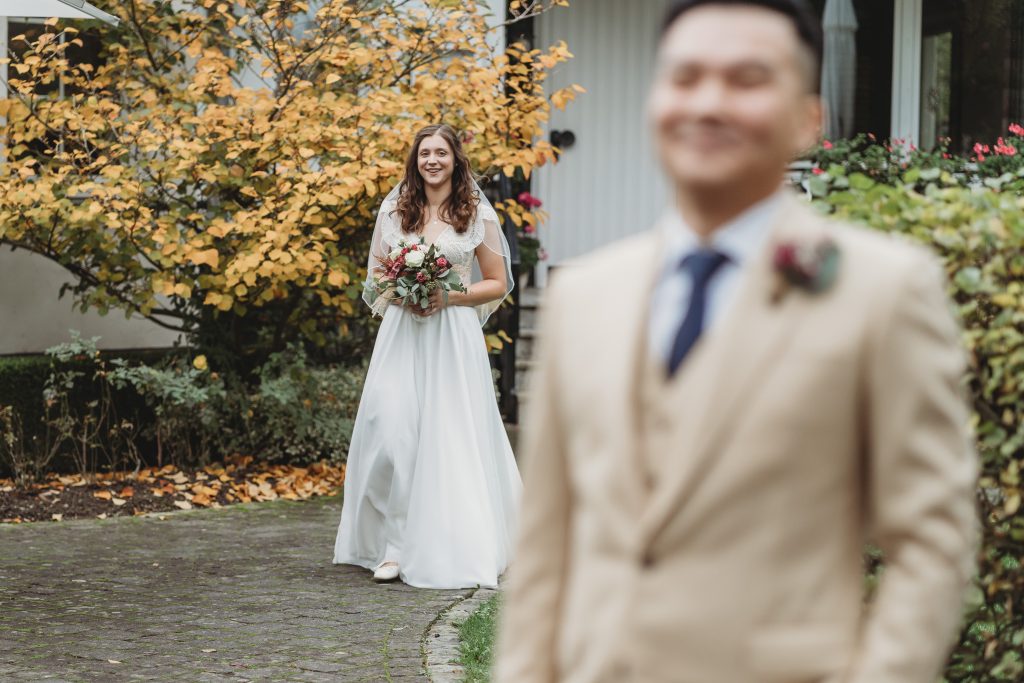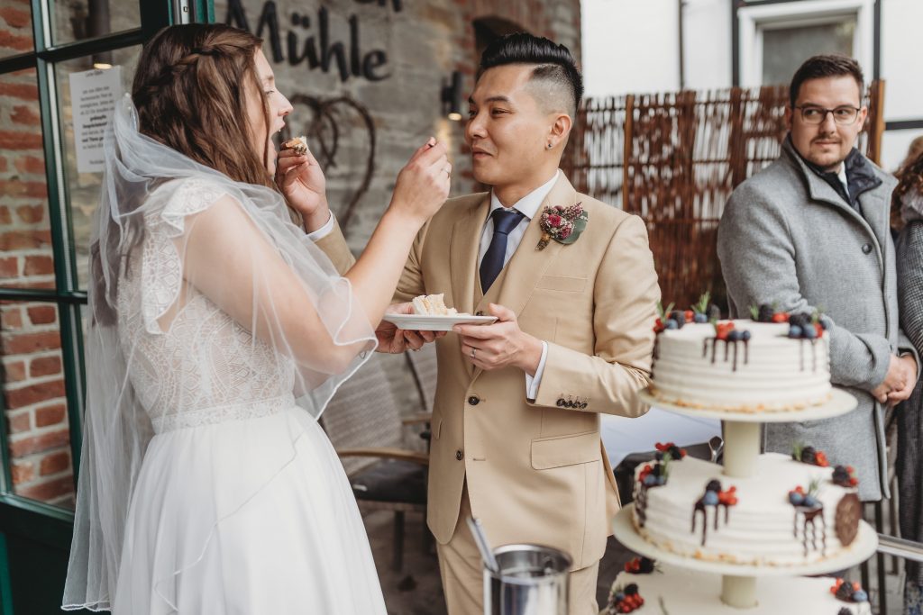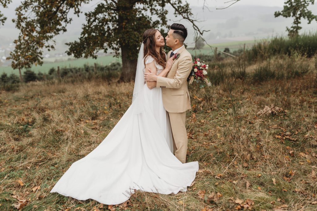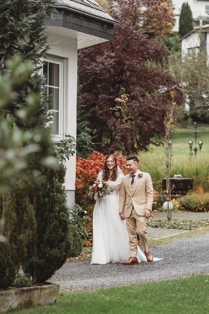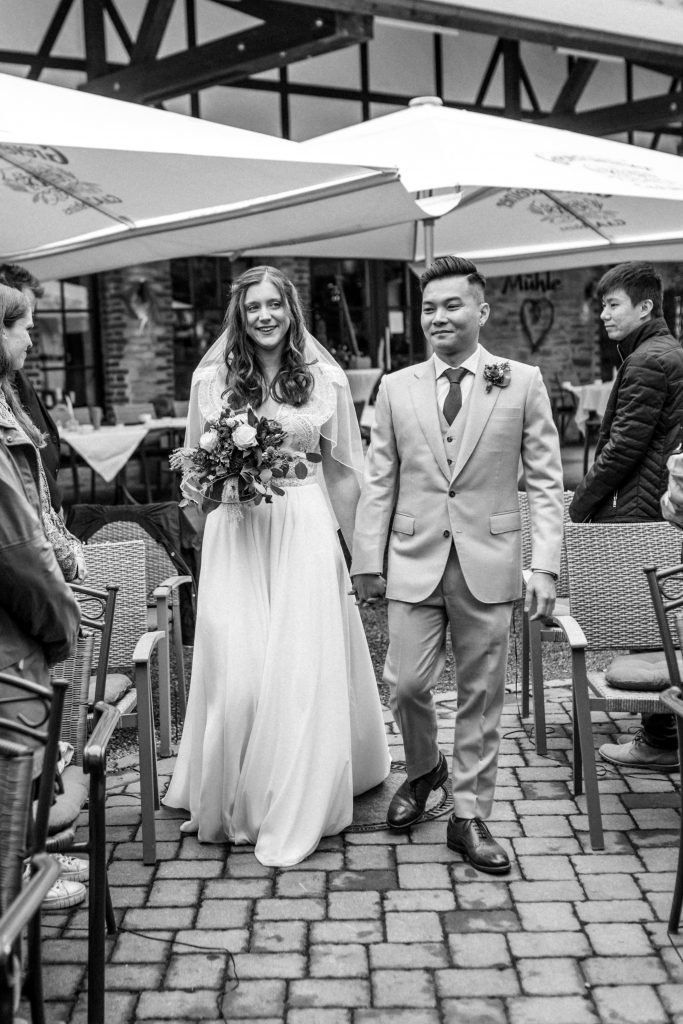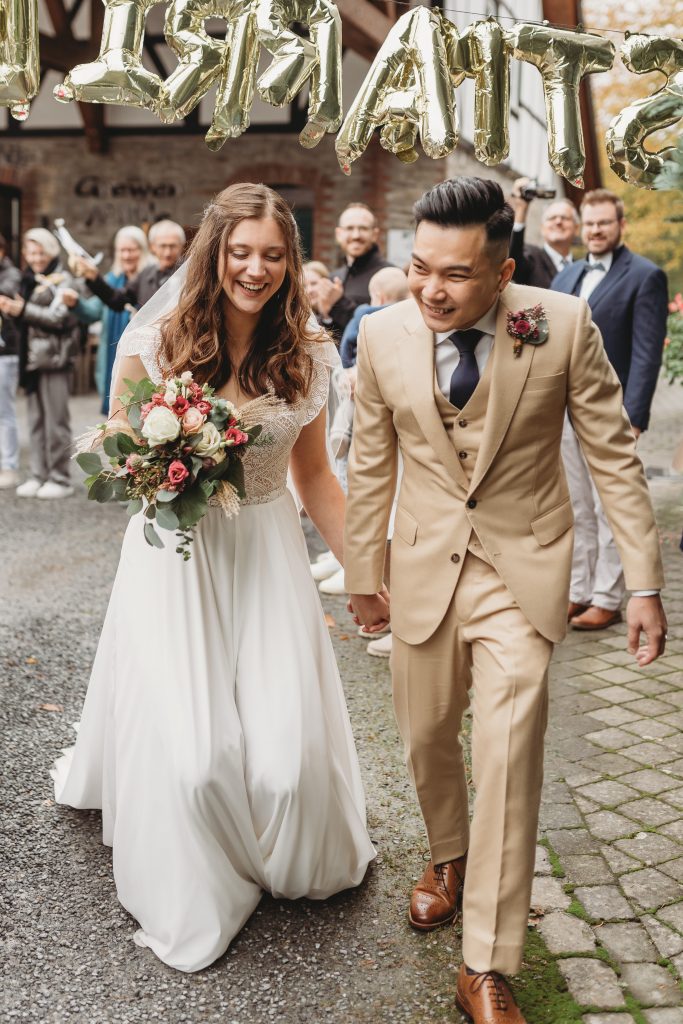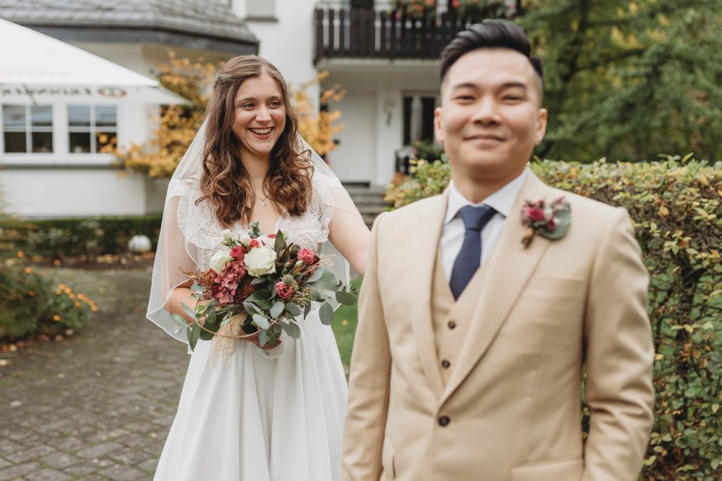 Annika and Kenneth celebrated a stunning, multicultural wedding at the Grewen Mühle. The wonderful day began with a first look of the couple in the venue’s garden and continued with a formal ceremony on-site with Katrin from “Pretty Words.” The couple’s family and friends traveled from all over the world to celebrate their love, which began with a long-distance relationship between Singapore and Germany. Afterwards, the guests celebrated with a champagne reception and a wedding cake from Konditorei Krengel, and we were able to sneak away for a beautiful, autumnal couple’s photoshoot. Afterwards, the guests from all over the world celebrated at the Grewen Mühle.