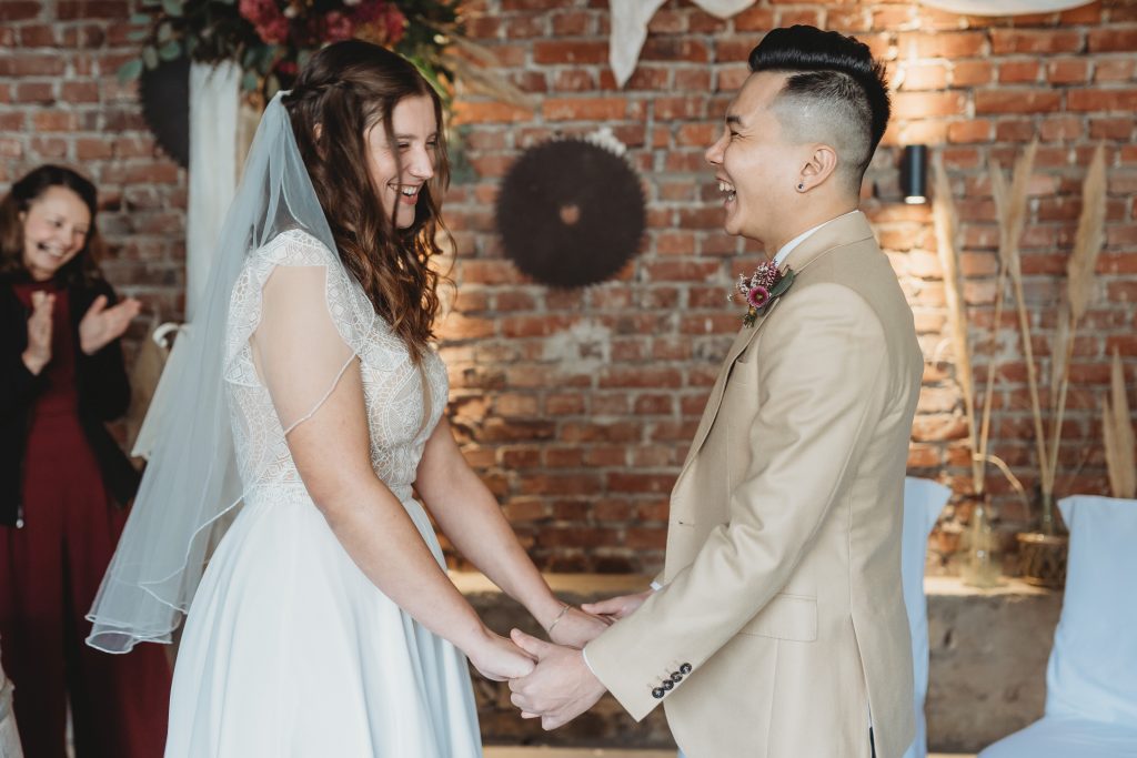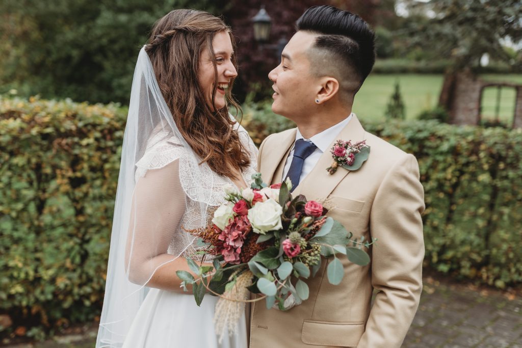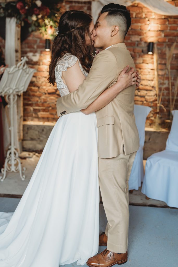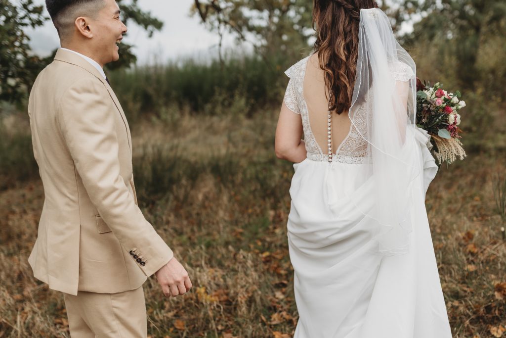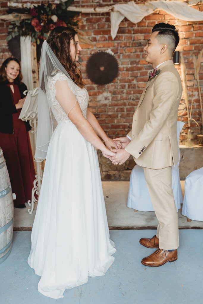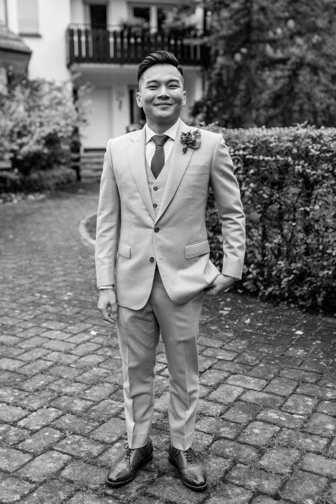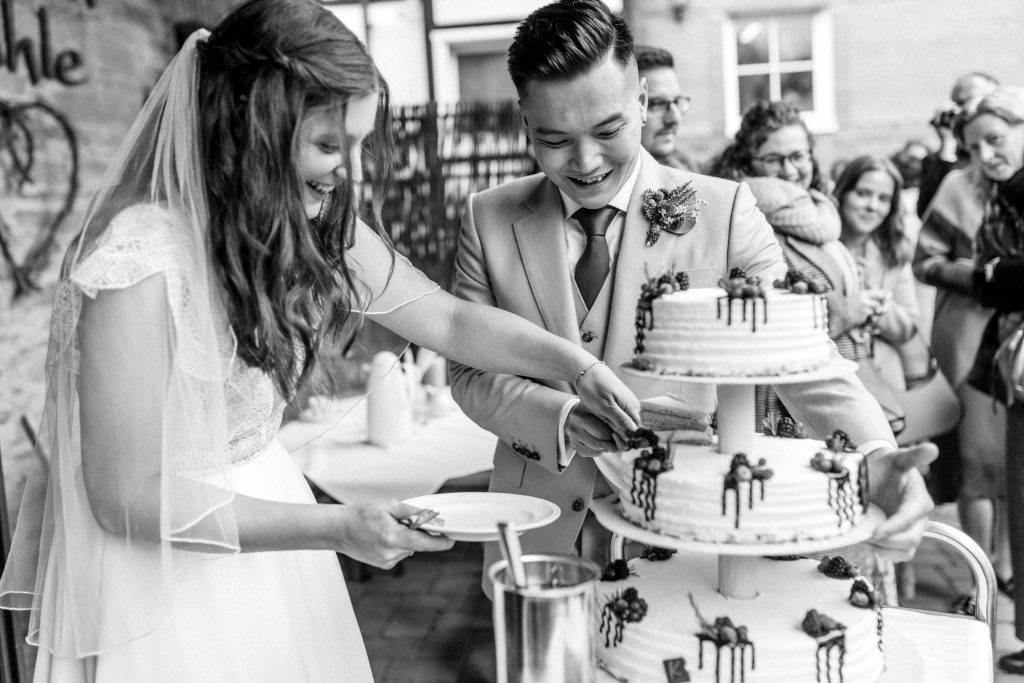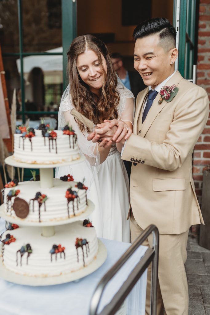 Annika and Kenneth celebrated a stunning, multicultural wedding at the Grewen Mühle. The wonderful day began with a first look of the couple in the venue’s garden and continued with a formal ceremony on-site with Katrin from “Pretty Words.” The couple’s family and friends traveled from all over the world to celebrate their love, which began with a long-distance relationship between Singapore and Germany. Afterwards, the guests celebrated with a champagne reception and a wedding cake from Konditorei Krengel, and we were able to sneak away for a beautiful, autumnal couple’s photoshoot. Afterwards, the guests from all over the world celebrated at the Grewen Mühle.